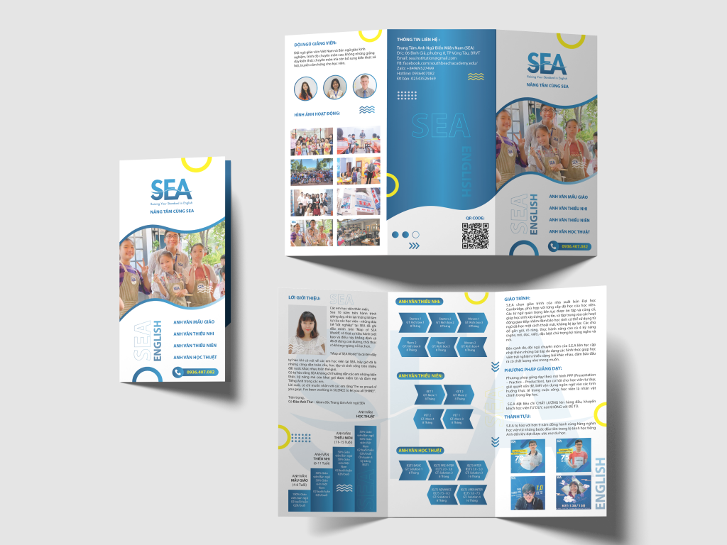 Trung Tâm Anh Ngữ Biển Miền Nam, tên tiếng anh là SEA, màu chủ đạo là xanh biển và vàng (xanh nhiều hơn vàng), trên tờ rơi thể hiện logo trung tâm.